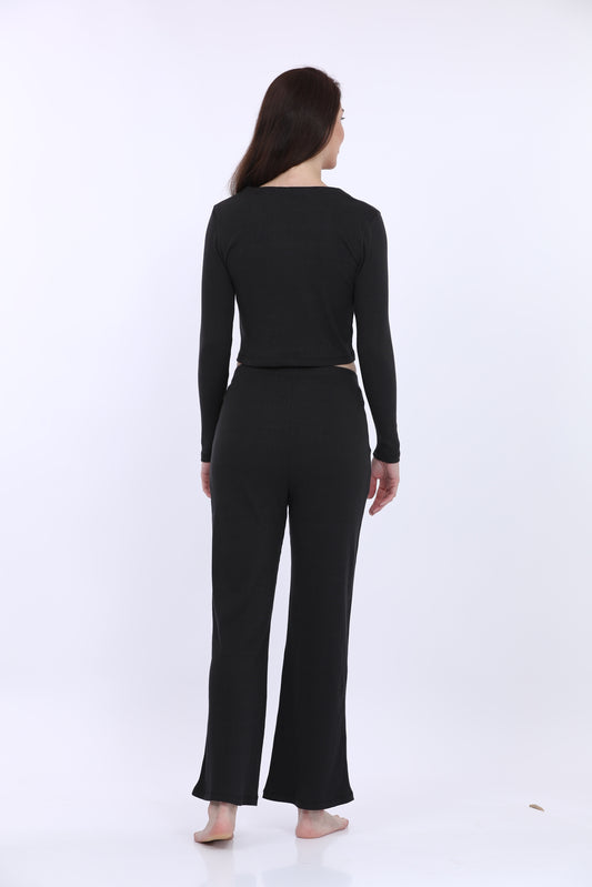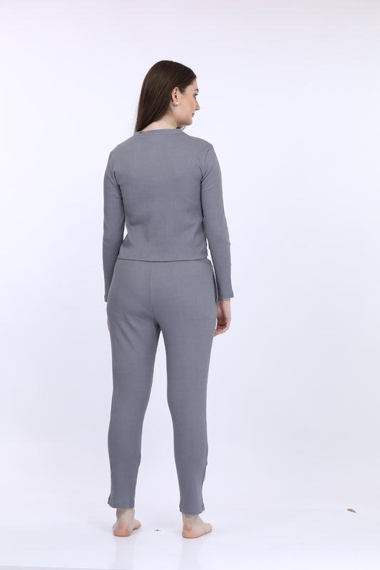 Grey Ribbed Full Sleeve Crop Co-Ord Set